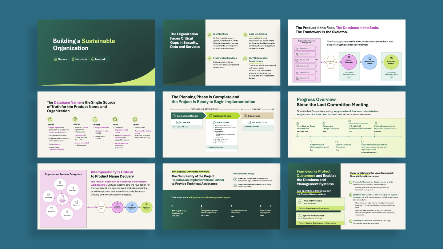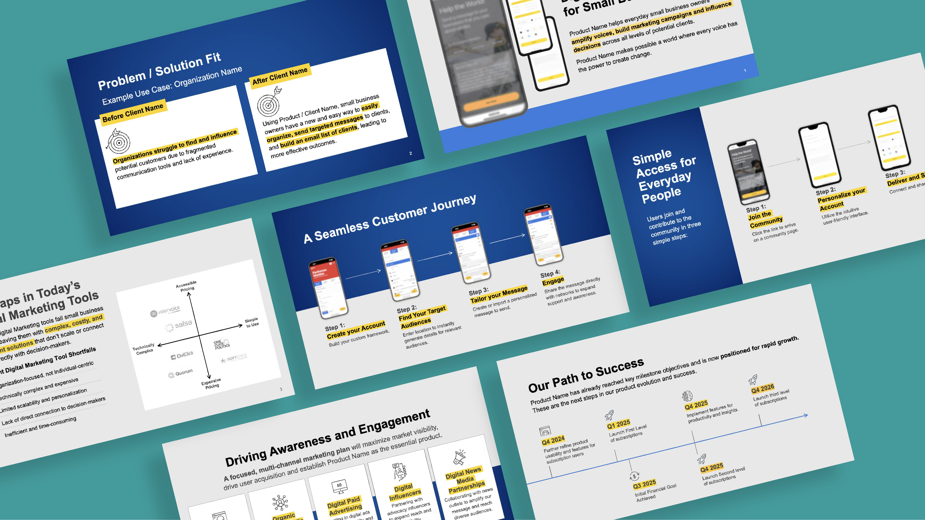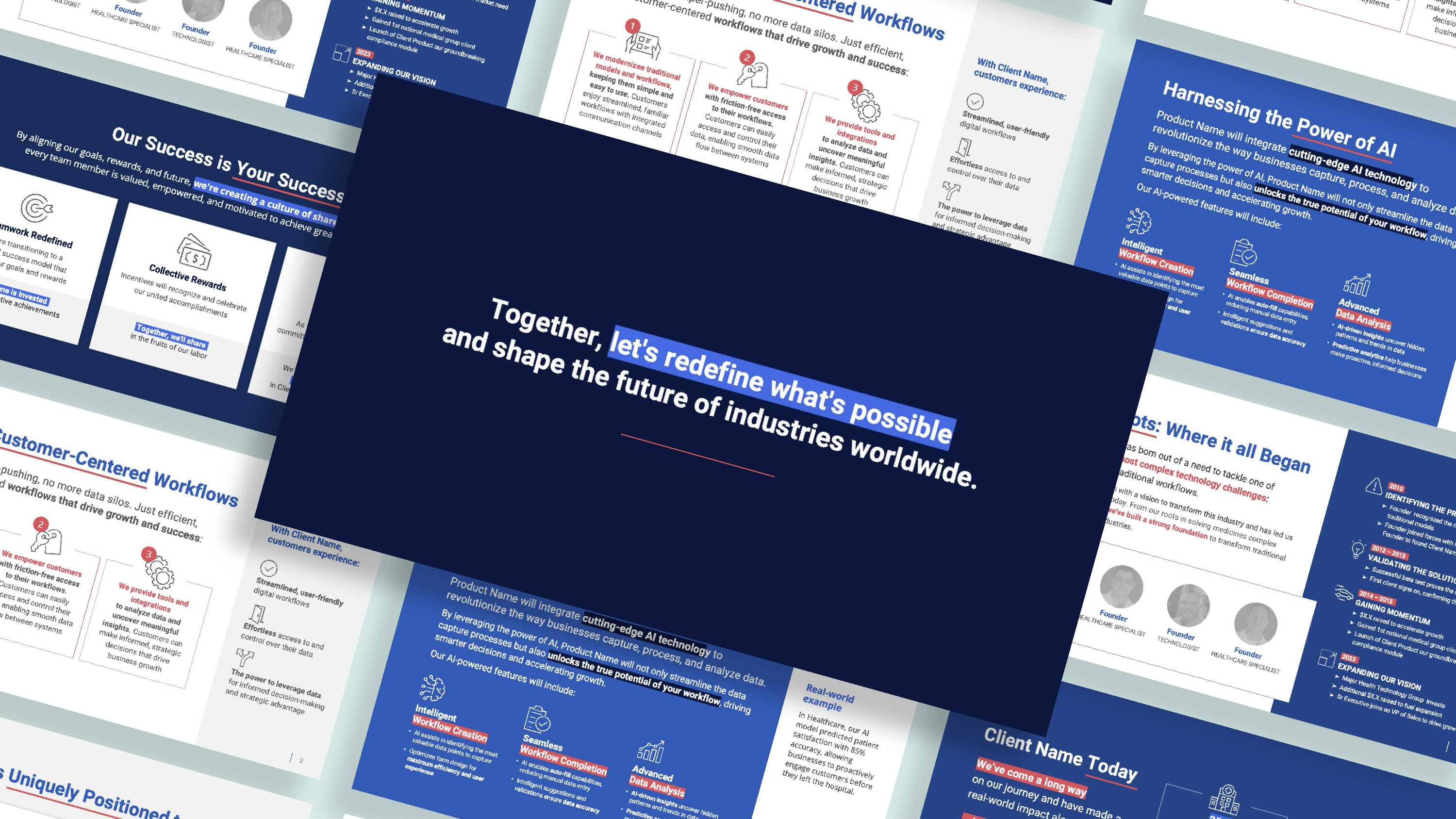 We work with founders, executives, and service-based businesses to transform complex ideas into clear, compelling presentations that win trust, spark confidence, and drive decisions.