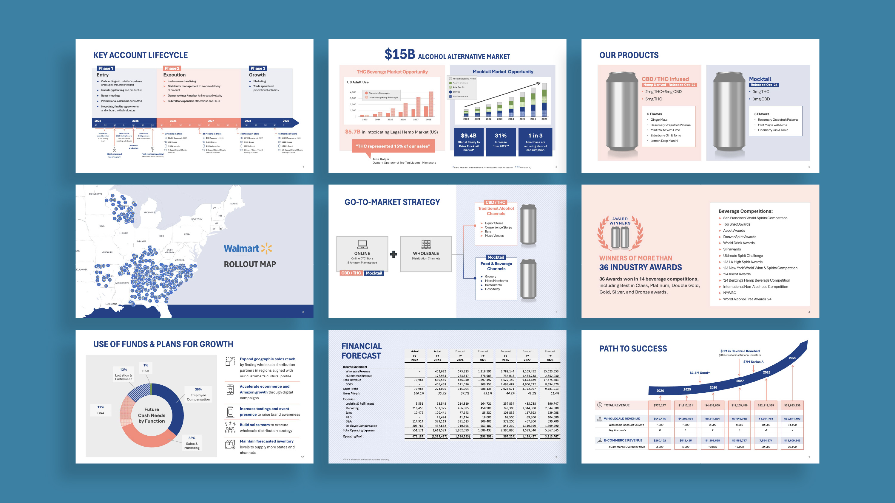 We redesigned a beverage startup’s pitch deck to clarify their value, showcase traction, and highlight growth—helping them confidently secure funding.